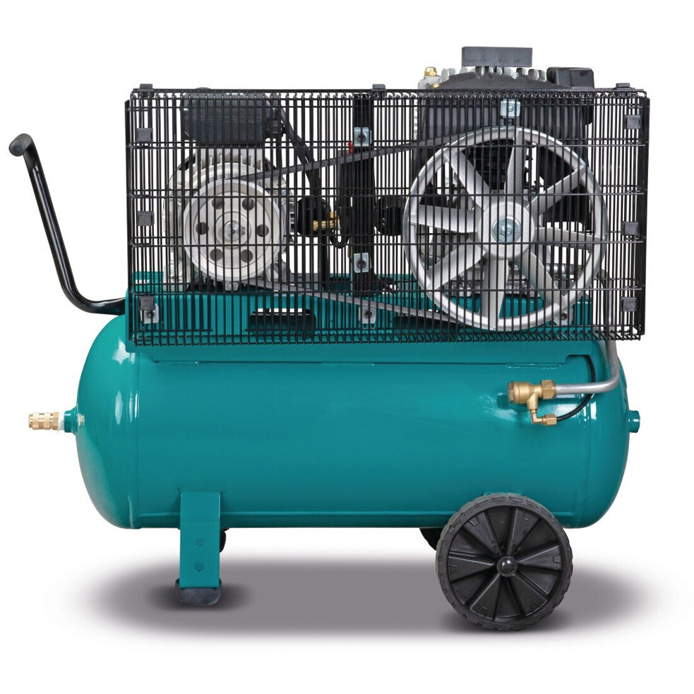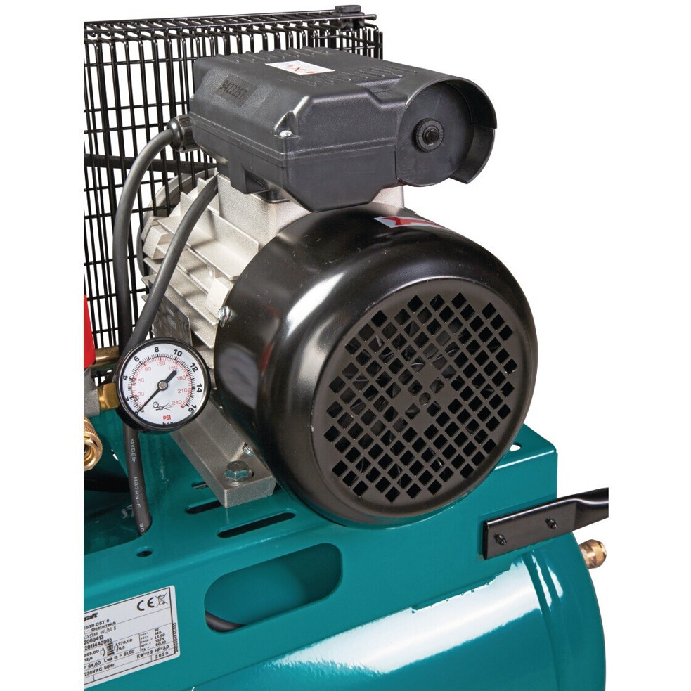 Das Gerät verfügt über zwei Zylinder, die für eine stabile Leistung sorgen, und ist in einem ansprechenden türkisen Gehäuse gehalten. Mit einem Betriebsgeräusch von 94 dB ist dieser Kompressor etwas lauter, bietet jedoch auch die nötige Power, um selbst schwierigste Aufgaben zu bewältigen.