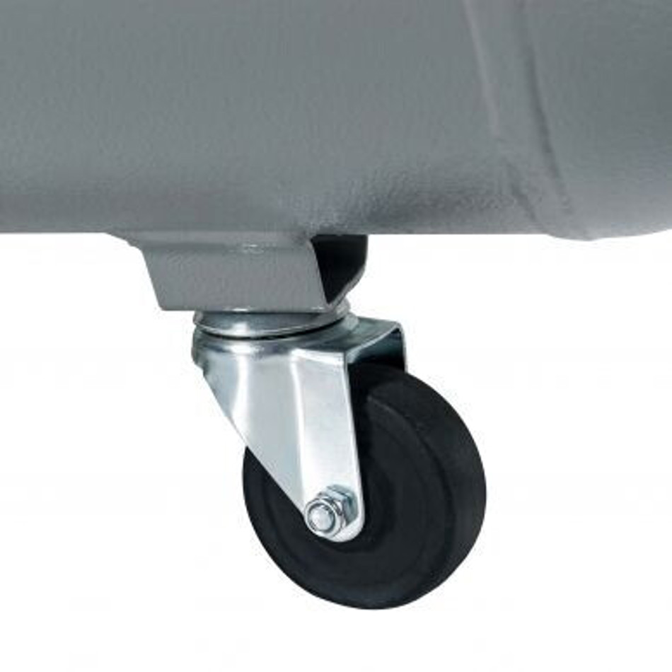 Seine Mobilität wird durch das fahrbare Design gewährleistet, sodass Sie ihn mühelos an verschiedenen Orten einsetzen können. Der Kompressor ist mit zwei Zylindern ausgestattet und verfügt über einen robusten grauen Gehäuse, das für Langlebigkeit steht.