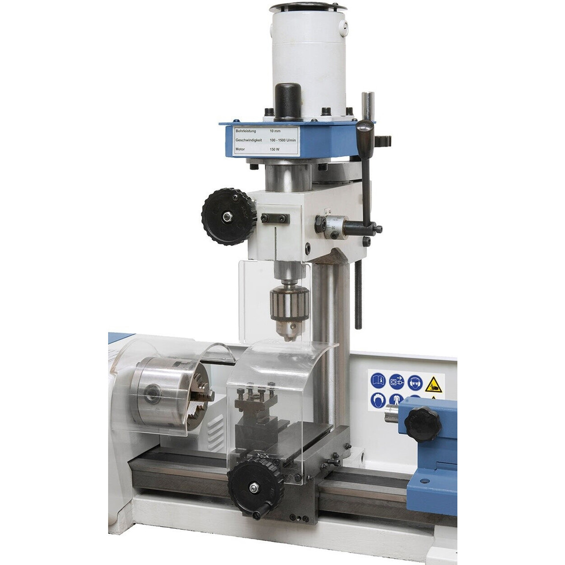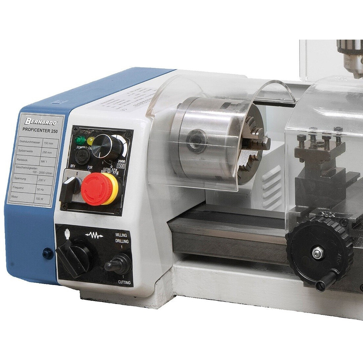 Die Bernardo Proficenter 250 kommt standardmäßig mit einer hochwertigen Werkzeugausstattung daher und die kompakten Abmessungen von 650 x 335 x 520 cm machen sie ideal für Werkstätten mit begrenztem Platz. Zu den besonderen Merkmalen gehört die Spindelaufnahme MK2, ein stufenlos regelbarer Antrieb und die Pinolenaufnahme MK1 mit einer Spindelbohrung von 9 mm.