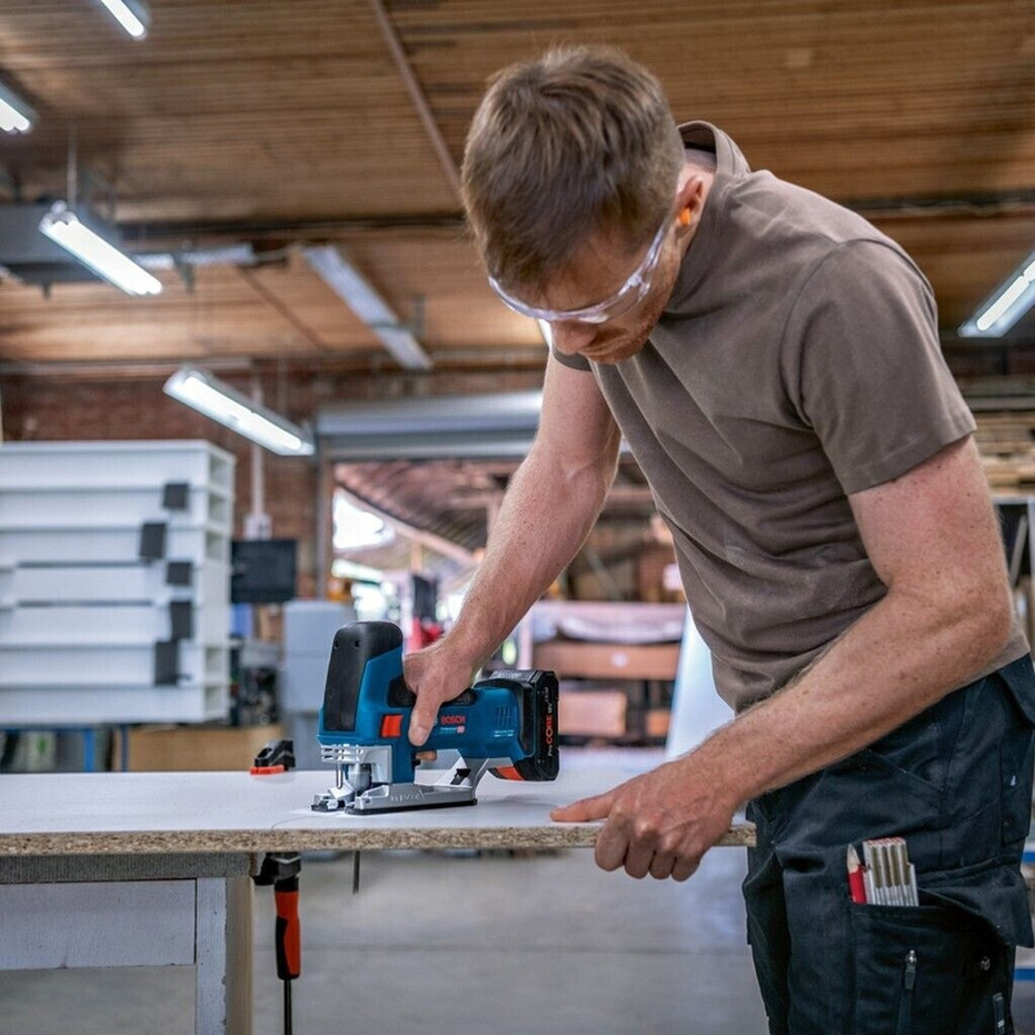 Entdecken Sie die Bosch GST 18V-155 SC, die leistungsstarke Akku-Stichsäge für präzise Schnitte in Holz. Angetrieben von einer fortschrittlichen 18V Li-Ion Technologie, ermöglicht dieses Gerät eine herausragende Mobilität ohne lästige Kabel. Mit einem geringen Gewicht von nur 2 kg ist die Handhabung auch über längere Zeiträume hinweg komfortabel.