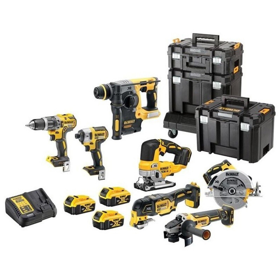 Das Set beinhaltet eine Akku-Schlagbohrmaschine, einen Akku-Schlagschrauber, eine Akku-Handkreissäge, ein Akku-Multi-Tool, eine Akku-Pendelhubstichsäge und einen Akku-Winkelschleifer – alles, was Sie brauchen, um schlagbohren, bohren, sägen oder schleifen zu können. Ergänzt wird das Set durch ein Schnellladegerät, damit Sie immer bereit sind, Ihre Projekte in Angriff zu nehmen.