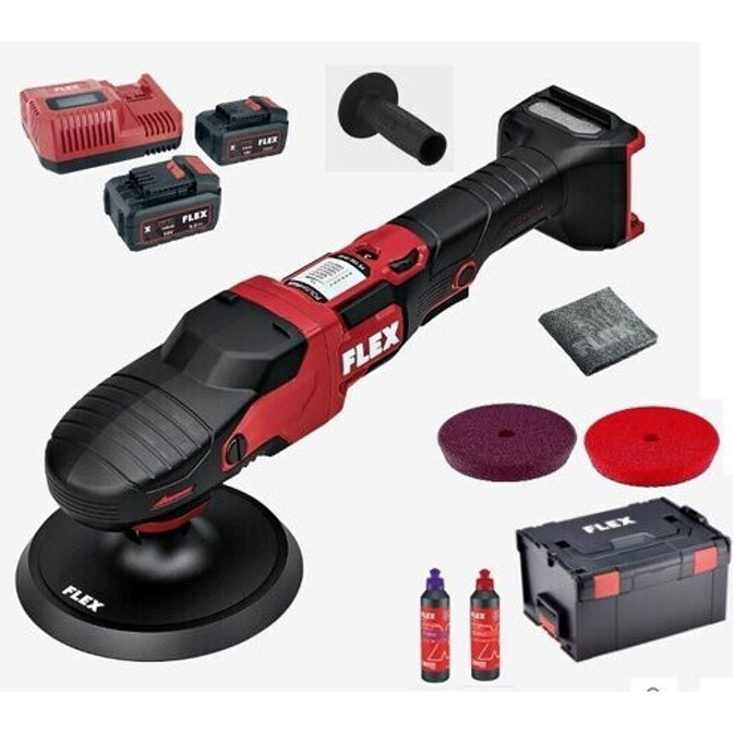 Die Flex PE Serie überzeugt durch ihr elegantes Design in den Farben schwarz und rot. Der Lieferumfang umfasst neben der Maschine auch ein Ladegerät, einen Schleifteller, einen Zusatzhandgriff sowie ein komplettes Polierschwamm-Set, Politur und ein Mikrofasertuch – alles, was Sie für den perfekten Polierprozess benötigen.