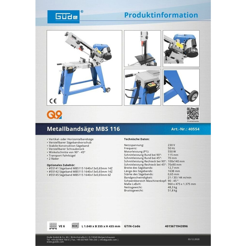 Güde MBS 116 Bandsäge - Präzise und Leistungsstark für Ihre Werkstatt