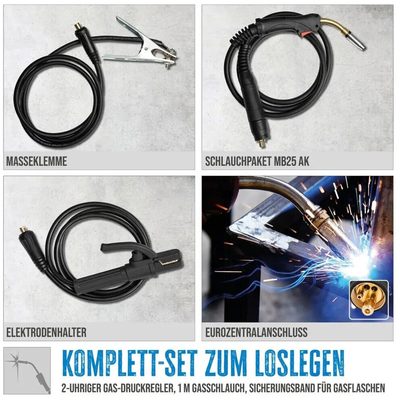 | Lieferumfang: | Schweißgerät, Schlauchschellen, Schlauchpaket, Fülldraht, Elektroden, Masseklemme, Gasschlauch |