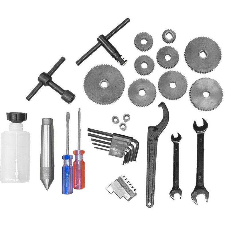 Im Lieferumfang sind wertvolle Zubehörteile wie eine Spänewanne, eine Spänerückwand, ein Satz Wechselräder, ein Bedienwerkzeug, ein Vierfachstahlhalter sowie feste Körnerspitzen in den Größen MK3 und MK2 sowie ein 3-Backen-Futter enthalten, was Ihren Einstieg in die Verarbeitung erleichtert.