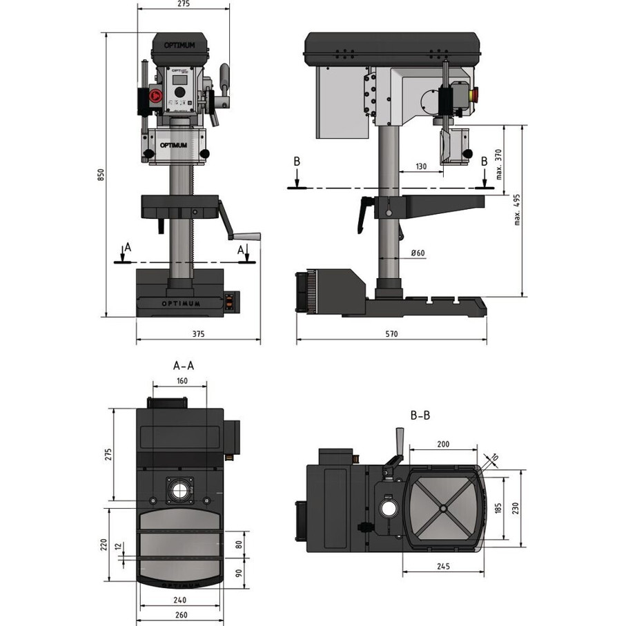 Das robuste, graue Gehäuse und das Gewicht von 73 kg sorgen für die Stabilität, die Sie für präzise Bohrungen benötigen. Der Säulendurchmesser von 60 mm und die Ausladung von 235 mm machen diese Maschine besonders vielseitig.