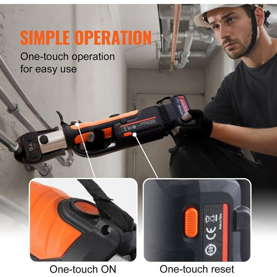 Entdecken Sie die VEVOR Hydraulische Presszange (PZ-1550), das perfekte Akku-Presswerkzeug für professionelle Anwendungen. Angetrieben von einem leistungsstarken 18 V Akku, bietet dieses Werkzeug unabhängig von einer Steckdose höchste Flexibilität und Mobilität.